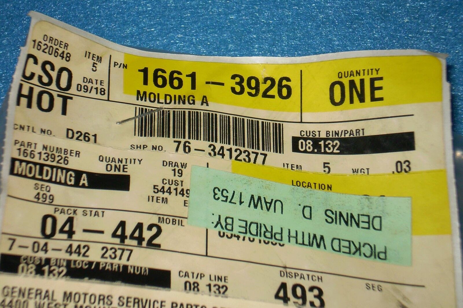 This molding is for the drivers side fender. This is a new, never installed molding. This is the perfect economical replacement for the damaged or missing molding on yours or your customers vehicle.